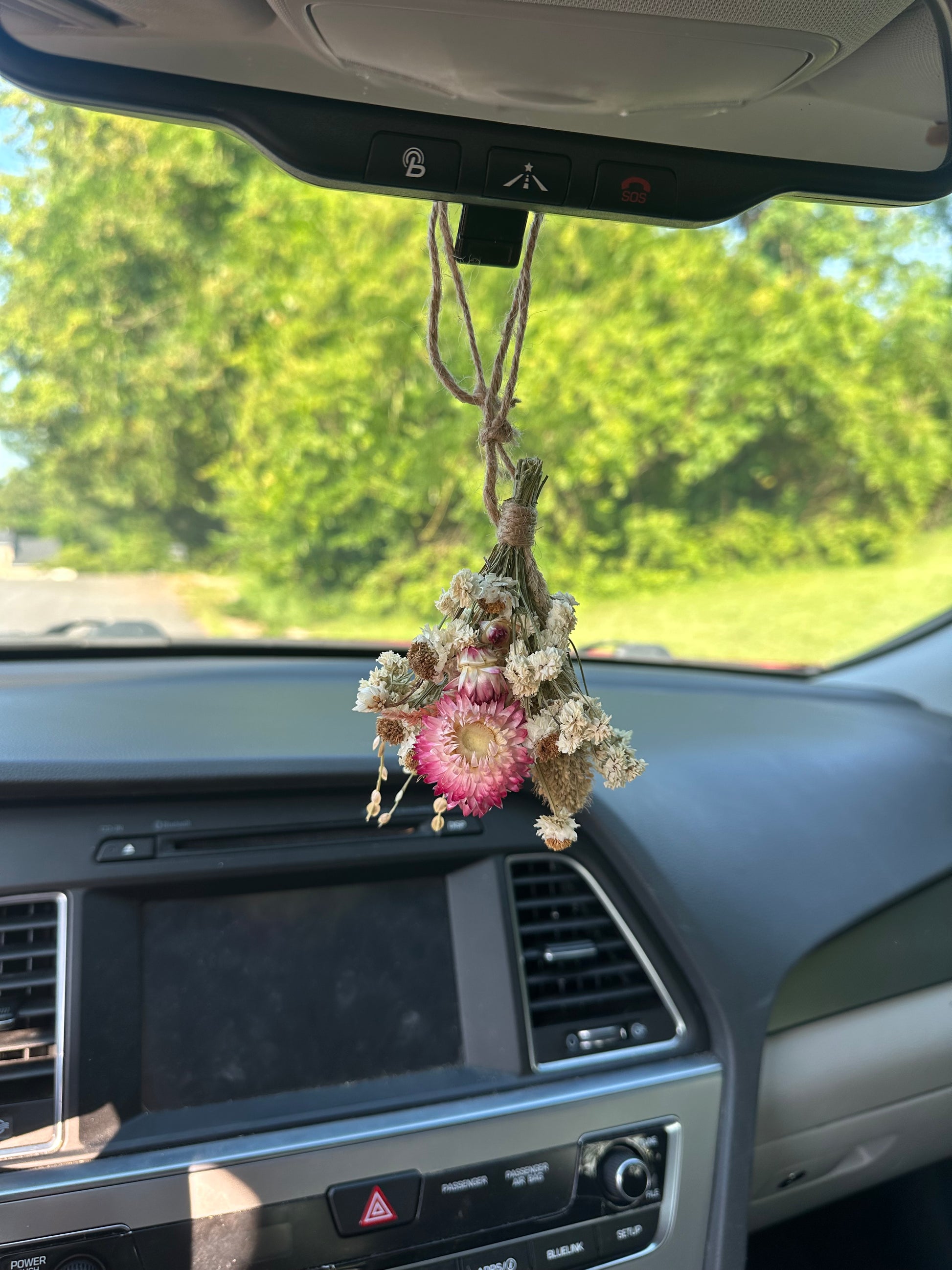 Made to hang on your rear view mirror. Strings adjust by sliding the adjustable knots up or down.